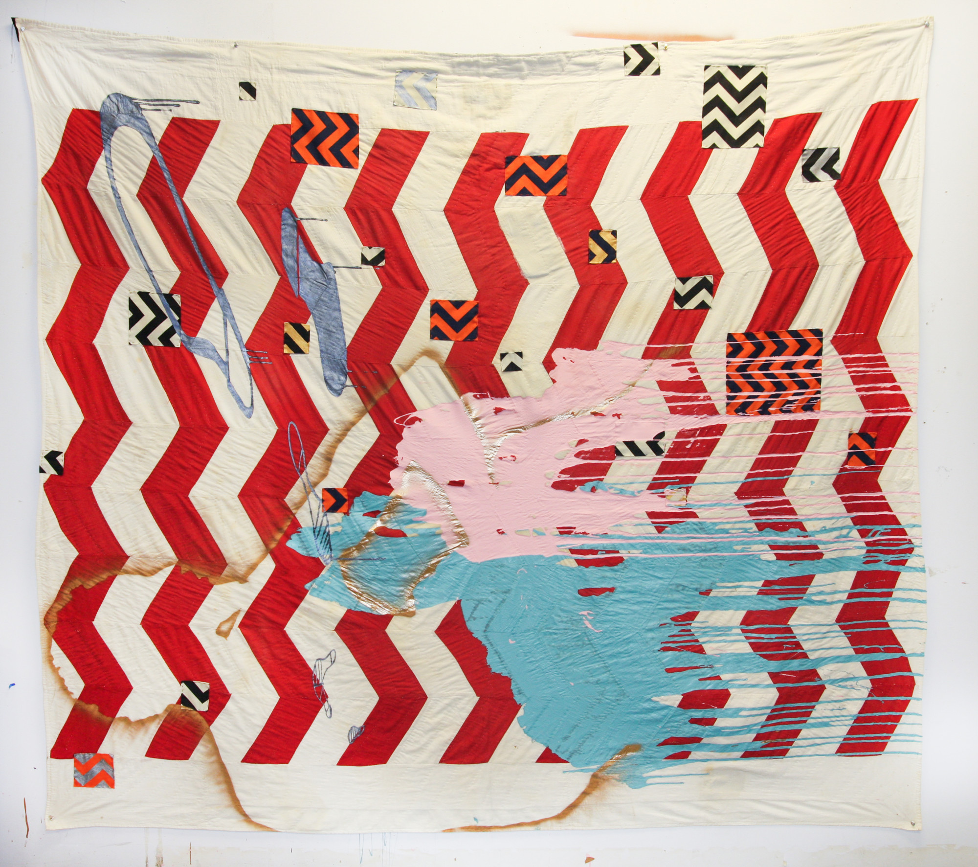 Shifter, 2014. Antique quilt, assorted textiles, acrylic, spray paint, 80 x 76 in. © Sanford Biggers
