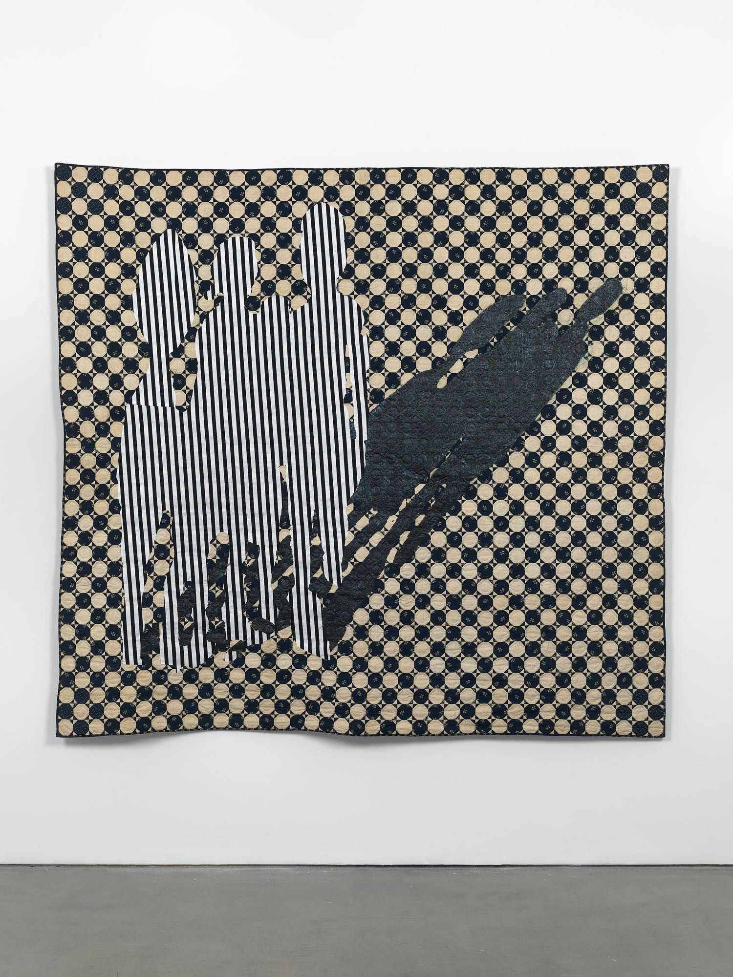 Pas de Deux, 2016. Antique quilt, assorted textiles, burnt cork, charcoal, 83 x 75 in. © Sanford Biggers