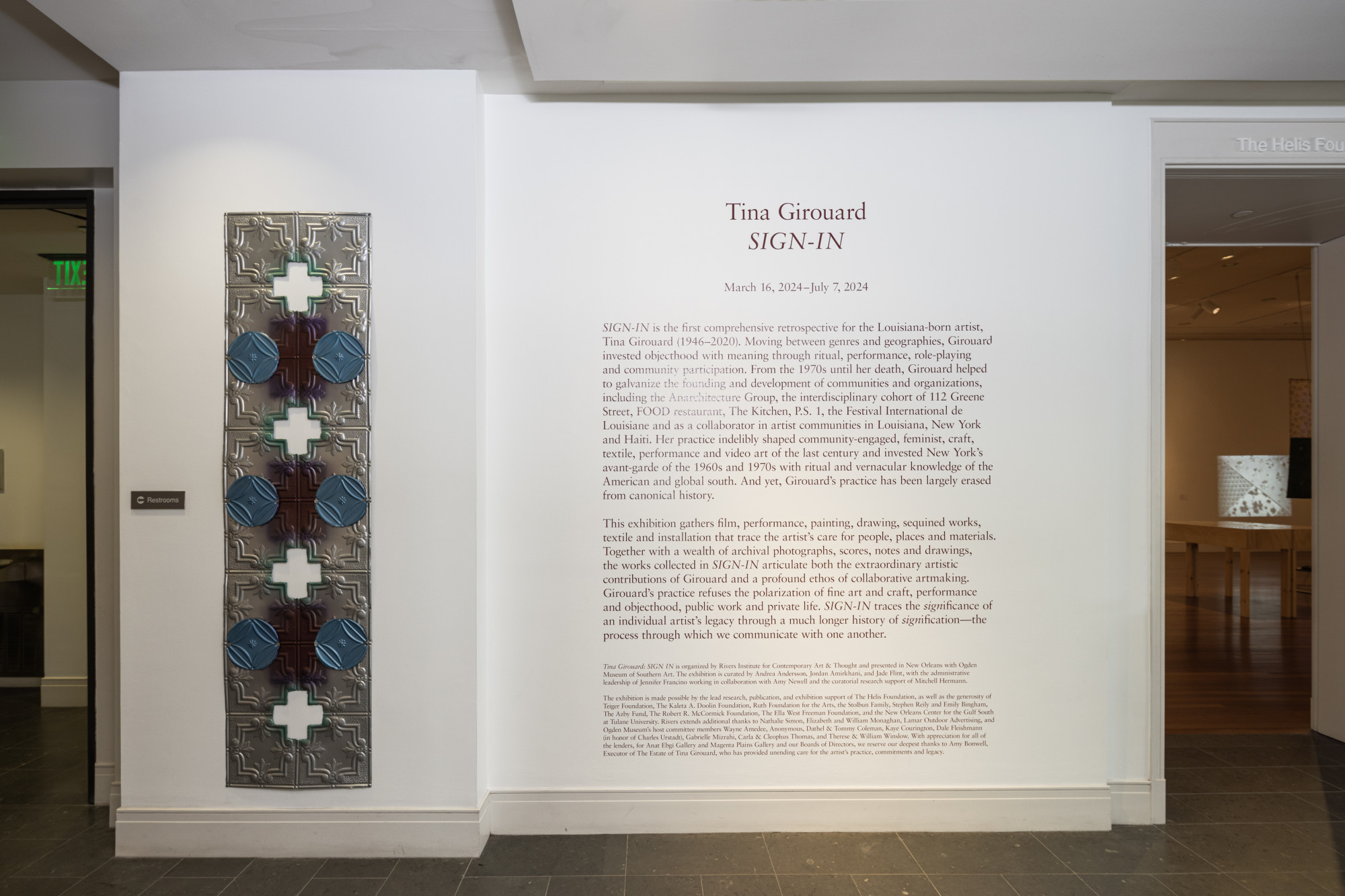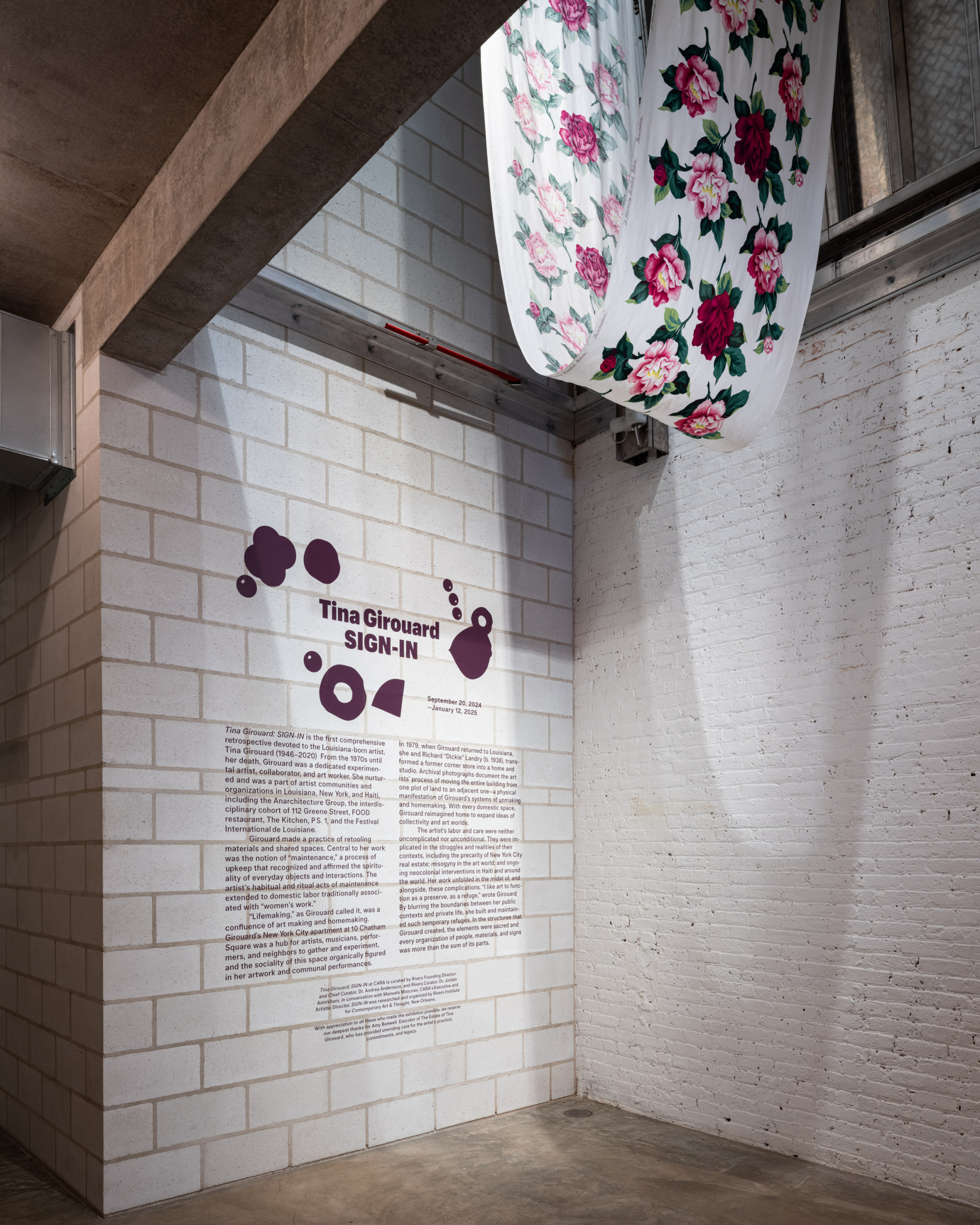 SIGN-IN is the first comprehensive retrospective for the Louisiana-born artist, Tina Girouard (1946-2020). Moving between genres and geographies, Girouard invested objecthood with meaning through ritual, performance, role-playing, and community participation. From the 1970s until her death, Girouard played a galvanizing role in the founding and development of communities and organizations, including the Anarchitecture Group, the interdisciplinary cohort of 112 Greene Street, FOOD restaurant, The Kitchen, P.S. 1, the Festival International de la Louisiane, and as a collaborator in artist communities in Louisiana, New York, and Haiti. Her practice indelibly shaped community-engaged, feminist, craft, textile, performance, and video art of the last century and invested New York’s avant-garde of the 1960s and 1970s with ritual and vernacular knowledge of the American and global south. And yet, Girouard’s practice, has been largely erased from canonical history.